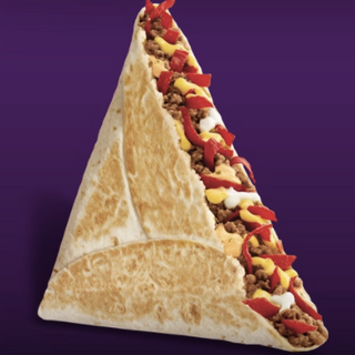 The Grilled Stuft Nacho starts with a flour tortilla and is filled with seasoned beef, warm nacho cheese, zesty cheesy-jalapeno sauce, red tortilla strips, and sour cream. The tortilla is folded in the shape of a triangle to fit the shape of a large tortilla chip.